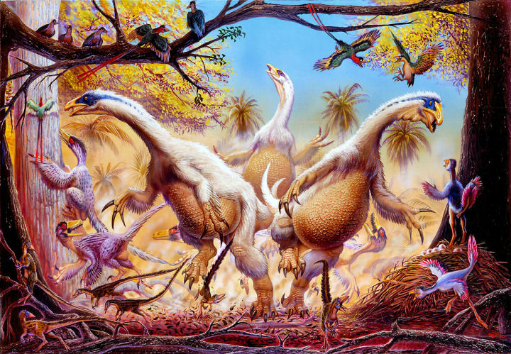 Scène de la Chine préhistorique : Trois Beipiaosaurus effraient des Sinosauropteryx à gauche, des Caudipteryx à droite et des Confuciusornis perchés