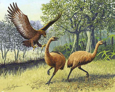7) Des espèces disparues par l'intervention humaine L'aigle de Haast s'attaquant à des moas en Nouvelle Zélande Il y a au moins 30 000 ans et jusqu'il y a moins de 500 ans, une espèce d'aigle géant d'une envergure de 3 mètres, l'aigle de Haast, habitait encore les forêts de Nouvelle Zélande. Il fut chassé jusqu'à l'exctinction par les Polynésiens colonisateurs qui exterminèrent également les Moas, ses principales proies. D'autres espèces d'oiseaux de proie ont également disparues sous l'impulsion de l'Homme. C'est le cas des nocturnes qui peuplaient l'archipel des Mascareignes dans l'océan Indien. Le hibou de Gruchet a disparu durant le XVIIe siècle lors de la colonisation de l'île de la Réunion. La chouette chevêche de Rodrigues, autrefois endémique de l'île Rodrigues, voisine de l'île de la Réunion, a également disparue vers 1730. Le petit-duc de Commerson résidait sur l'île Maurice, située entre la Réunion et Rodrigues, et a été observé pour la dernière fois en 1837. Son extinction remonterait à 1859. Plus récemment, la ninoxe rieuse, habitante de la Nouvelle Zélande, a disparu depuis l'arrivée des premiers colons et plus aucune observation n'a été effectuée depuis 1930. Côté diurnes, outre l'aigle de Haast cité plus haut, le faucon crécerelle de Dubois, endémique de l'île de la Réunion, s'est éteint autour de 1700. Le caracara de Guadalupe s'est également éteint suite aux persécutions des éleveurs de bétail. La dernière observation de cet oiseau date de 1900.