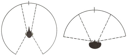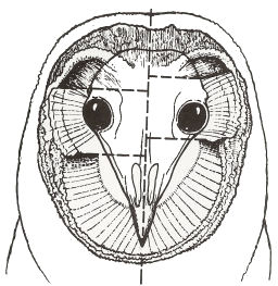 3) Les différences entre espèces Yeux de jour et yeux de nuit La première chose qui frappe quand on observe des oiseaux de proie ce sont leurs yeux. Les nocturnes ont des yeux frontaux, très grands, presque humains, mais immobiles et avec un champ de vision restreint. Leur champ de vision n'est que 110°, dont seulement 60° de recouvrement (en comparaison, l'homme a un champ de vision de 180° dont 110° de recouvrement). Cette restriction est cependant compensée par l'extraordinaire mobilité de leur tête qu'ils peuvent faire tourner, sans torticolis, jusqu'à 270°. Ils disposent d'une excellente vision en relief, qu'ils améliorent encore en remuant sans cesse la tête. Ces mouvements, que nous trouvons étranges et amusants, leur permettent simplement de voir les objets sous une multitude d'angles légèrement différents et d'évaluer au mieux ce qu'ils voient, avant de décider de l'action à entreprendre. Malheureusement, cette formidable acuité visuelle n'est valable qu'à grande distance car la vision à courte distance est, elle, très déficiente : le rapace nocturne doit tâter sa proie du bec et des vibrisses car il est presbyte. Enfin, contrairement à l'opinion répandue, les oiseaux de proie nocturnes (à part la chouette effraie) ne sont pas éblouis par la lumière du jour. Les diurnes, eux, ont une vision binoculaire de plus de 50°, grâce à leurs yeux dirigés vers l'avant, et ceci leur procure une bonne appréciation de la profondeur du champ et des distances. Mais cette excellente vision diminue au fur et à mesure que l'obscurité s'installe. Voilà pourquoi les rapaces diurnes ne chassent que de jour ou au crépuscule mais jamais dans la nuit noire.