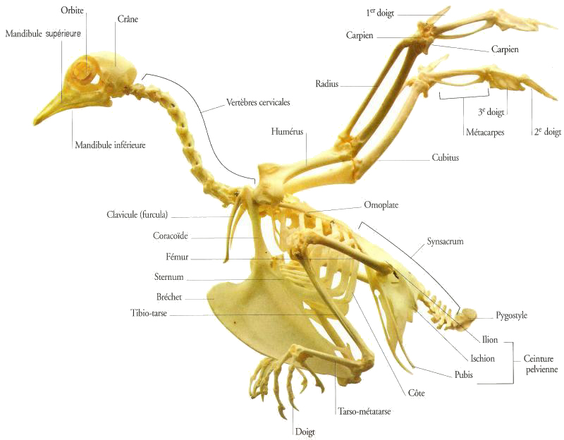 Les os des oiseaux modernes sont particulièrement légers, car remplis de cavités aériennes qui remplacent la moelle. Des entretoises osseuses rendent ces os très solides, principe de pneumatisation. C'est surtout dans la région de la main et du poignet que les membres antérieurs sont profondément modifiés. Les "doigts" des oiseaux ont fusionnés en formant une structure étroite, appelée le carpométacarpe. Les os du poignet (os carpiens) sont solides et permettent une bonne articulation de la "main". La fourchette, l'omoplate et l'os coracoïde assurent la base de l'aile une position éloignée du corps pendant le vol. Leur sternum particulièrement développé est appelé bréchet et sert de point de fixation aux puissants muscles des ailes. Les Oiseaux sont des bipèdes. Cette bipédie implique que la ceinture pelvienne supporte l'entièreté du poids de l'animal lorsque celui-ci est debout. La ceinture pelvienne est donc par conséquent constituée de grands os fusionnés aux vertèbres arrières.