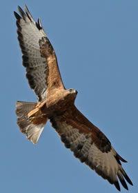 En vol, vu du dessous, la forme pâle a les couvertures crème à roux pâle, des taches carpiennes noires, les primaires à barres blanches, les secondaires barrées et pointées de noir et la queue crème. La forme rousse a les couvertures rousses, des taches carpiennes sombres et les pennes comme la forme pâle. La forme sombre a les couvertures noirâtres comme le corps, rémiges proches de la forme rousse, mais les secondaires sont davantage barrées. Tache pâle présente sur les primaires. La queue gris-blanc est généralement barrée de sombre avec une large bande subterminale. L'aire de répartition de la buse féroce va du sud-est de l'Europe et de l'Afrique du Nord jusqu'au lac Baïkal. Après la reproduction, les oiseaux migrent en petits groupes vers leurs quartiers d'hiver africains et sud-asiatiques.