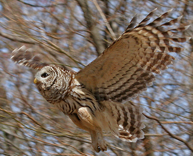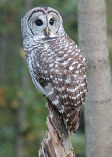 Une fois formé, les couples de chouettes rayées sont unis pour la vie, ou du moins jusqu'à la mort d'un des deux partenaires. La chouette rayée lance des appels nuptiaux toute l'année mais la reproduction ne début qu'en février, avant la nidification qui a lieu entre mars et août. Elle niche dans un arbre creux ou dans le nid abandonné d'un rapace oud'une corneille. La chouette rayée peut utiliser un nichoir dont le trou a un diamètre d'au moins quinze centimètres. La femelle pond 2 à 4 oeufs blancs qu'elle couve dès le premier oeuf pendant 28-33 jours. Le mâle apporte la nourriture à la femelle durant cette période. Si jamais la première ponte échoue, la femelle pond pondre une seconde couvée avec un nombre moindre d'oeufs que lors de la première ponte. Quand les jeunes quittent le nid à environ 4 semaines, ils ne sont pas encore capables de voler et ne font qu'explorer les alentours du nid. Ils prennent leur premier envol à 35-40 jours. Les parents prennent encore soin d'eux pendant 4 mois, durée beaucoup plus longue que chez la plupart des rapaces nocturnes. Les jeunes se dispersent ensuite, mais à courtes distances, généralement moins de 10 km. |