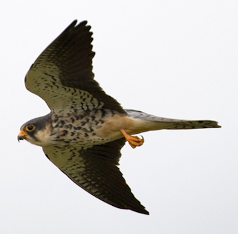 Le faucon de l'Amour est un proche parent du faucon kobez, même s'il est marginalement plus petit avec des ailes plus courtes et une queue plus longue. Le mâle adulte (photo ci-contre) a le bas du ventre, les culottes et les sous-couvertures alaires marron. La cire et le pourtour de l'oeil sont de même couleur. Le reste du corps a un plumage allant du gris foncé dans le dos au gris clair sur le ventre. La femelle (photo ci-dessous) ressemble plus à un faucon hobereau qu'à une femelle de faucon kobez. Elle a le dessus du corps gris avec des barres peu visibles, mais la tête ardoisée (le front peut être blanchâtre) et des moustaches noires. Le dessous du corps est de couleur crème à macules noires. Le bas de l'abdomen et les culottes sont rouille pâle. Les zones nues sont rouge orangé. Les deux sexes présentent une couleur de pattes rouge, caractéristique de leur espèce. Les juvéniles ont le dessus gris-brun avec des lisérés chamois/roux sur le dos et les ailes. Un collier pâle est moyennement visible. La queue est grise et le dessous du corps est de couleur crème, bien strié. Les zones nues sont jaunes. En vol, vu du dessous, le mâle a les couvertures blanches, tranchant avec des rémiges gris sombre. La queue est noirâtre et le bas de l'abdomen roux. En vol, vu du dessous, la femelle a des couvertures blanches à taches sombres plus pâles que le corps. La queue blanche présente des barres plus fines. On retrouve ce faucon en Russie centrale (de la province de Transbaïkalie jusqu'au fleuve Oussourie), dans le nord-est de la Chine et dans le nord de la Corée. Il hiverne dans le sud de l'Afrique, surtout depuis la Zambie jusqu'au nord-est de l'Afrique du Sud, tandis que certains oiseaux migrent dans le sud de l'Asie.