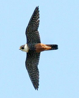 En vol, vu du dessous, l'espèce nominale a une tête noire avec une gorge pâle. Les ailes, la poitrine et la queue sont finement barrées de blanc. Le ventre est roux.