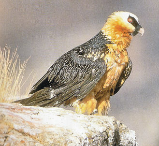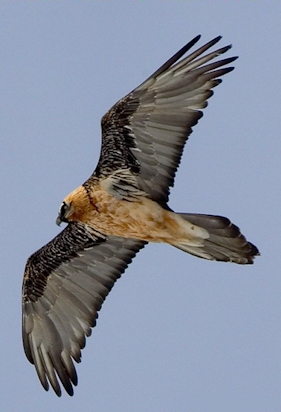 Le gypaète barbu est un grand vautour élancé aux L'adulte de l'espèce nominale a la tête crème, le masque, la barbe et les stries noirs. Le dessus du corps gris-noir et le rachis blanchâtre. Le dessous est orange chamois. La bande pectorale est noire discontinue. Le bec est gris sombre avec une pointe jaunâtre. La sous-espèce meridionalis est plus petit avec une tête non striée et pas de bande pectorale. Le bas des tarses est dénudé sur 4-5 cm. Les deux sexes sont de même coloration, la Les juvéniles sont entièrement foncé avec la tête et le cou noirs. La barbiche est plus courte. Le dessus est noirâtre, moucheté de chamois blanc. Le dessous est gris-brun. En vol, vu du dessous, l'espèce nominale a le corps crème orangé, des couvertures alaires noires et des rémiges gris ardoisé à pointe noire.