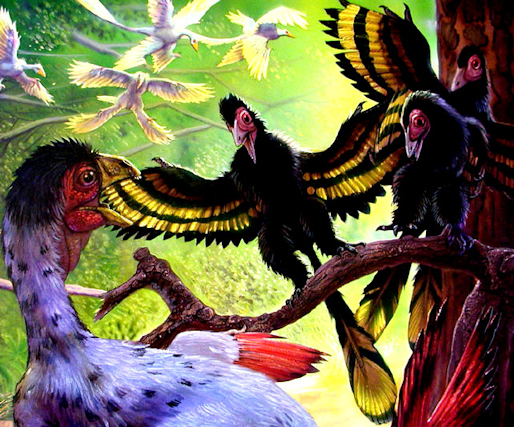 Jixiangornis harcelant un Caudipteryx, Microraptor en arrière-plan Jixiangornis est actuellement connu par un seul spécimen, un squelette complet retrouvé en 2002 dans la province de Liaoning en Chine. Il vécut au Crétacé inférieur, en Chine préhistorique.