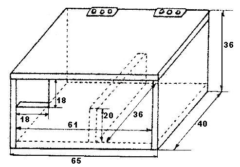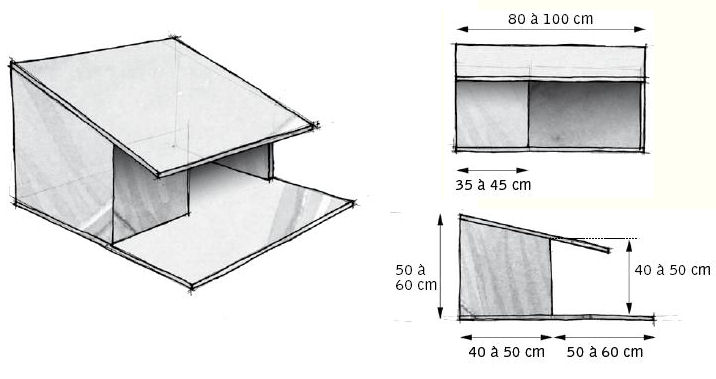 Planches de 2 cm d'épaisseur Petits côtés : 40 x 36 cm Toit et grands côtés : 65 x 40 cm Fond : 61 x 36 cm Cloison intérieure : 36 x 20 cm Trou d'envol : 18 x 18 cm