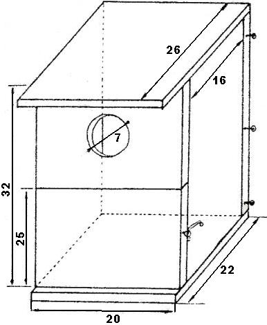 Planches de 2 cm d'épaisseur Face et dos : 32 x 20 cm Côtés : 32 x 16 cm Toit : 26 x 20 cm Fond : 22 x 20 cm Trou d'envol : 7 cm