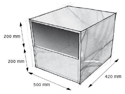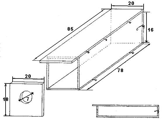 Planches de 2 cm d'épaisseur Face : 20 x 18 cm Dos : 20 x 16 cm Côtés : 76 x 16 cm Toit : 85 x 20 cm Fond : 78 x 20 cm Trou d'envol : 7 cm