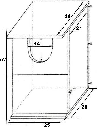 Planches de 2 cm d'épaisseur Face et dos : 52 x 25 cm Côtés : 52 x 21 cm Toit : 30 x 25 cm Fond : 28 x 25 cm Trou d'envol : 14 x 14 cm