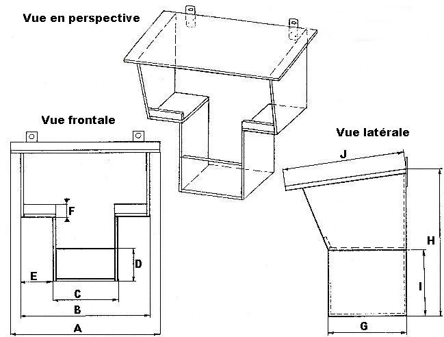 Epaisseur du toit : 2 cm Epaisseur des cloisons : 1 cm Modèle pour crécerelle, hulotte et effraie : A = 70 cm B = 60 cm C = 30 cm D = 15 cm E = 15 cm F = 6 cm G = 35 cm H = 65 cm I = 30 cm J = 55 cm