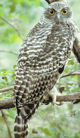 La ninoxe puissante une chouette élancé, de grande taille (c'est la plus grande espèce de rapace nocturne d'Australie). L'adulte a les parties supérieures qui varient du gris-brun au brun sombre et peuvent paraître bleuâtres sous une faible lumière. Le front est blanc-crème, le capuchon et la nuque finement tachetés de blanc-crème. Le dos et les ailes sont irrégulièrement barrés également de blanc-crème. La queue porte environ six barres transversales de la même couleur. Le disque facial brun sombre renferme deux yeux jaune brillant surmontés par des sourcils proéminents. Le bec corne bleuâtre est orné de poils rigides à sa base. Les parties inférieures blanc terne sont recouvertes de larges chevrons bruns qui vont de la gorge jusqu'au bas-ventre en formant des barres irrégulières. Le dessous de la queue porte de larges barres brunes et blanches. Les pattes sont emplumées jusqu'aux tarses. Les pieds jaune éclatant se terminent par des serres brunes. Les mâles sont considérablement plus grands que leurs compagnes, ils ont une tête plus large et un capuchon plus plat.