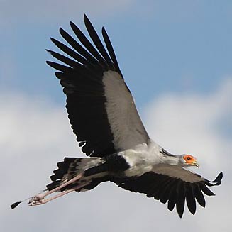 Le messager sagittaire est un très grand rapace terrestre aux ailes arrondies et à la queue graduée et allongée au centre.