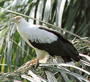 Le vautour palmiste est un petit vautour, ressemblant à un pygargue, avec de petites ailes larges et une courte queue arrondie. L'adulte est surtout blanc. La queue est noire avec le bout blanc. Les scapulaires, les rémiges et les couvertures